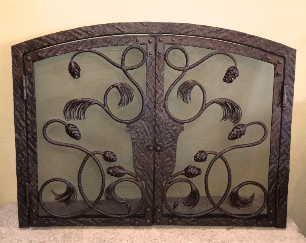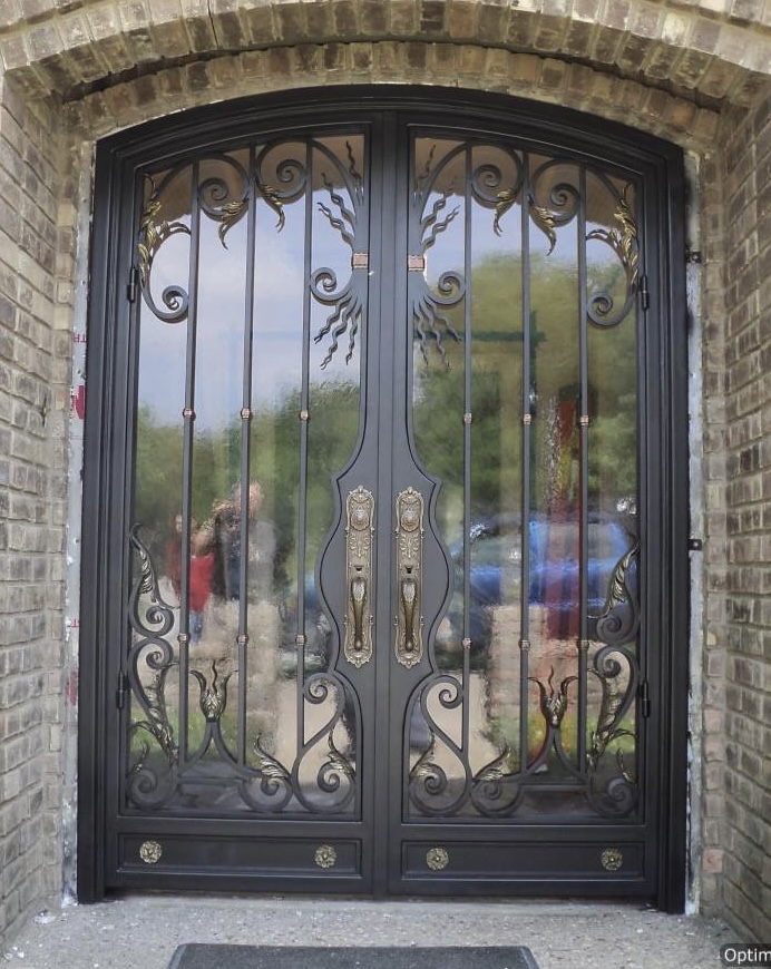 Combination of classical and art nouveau wrought iron door with solid brass acanthus leaves, brass hardware, brass rosettes, and brass-copper collars.
