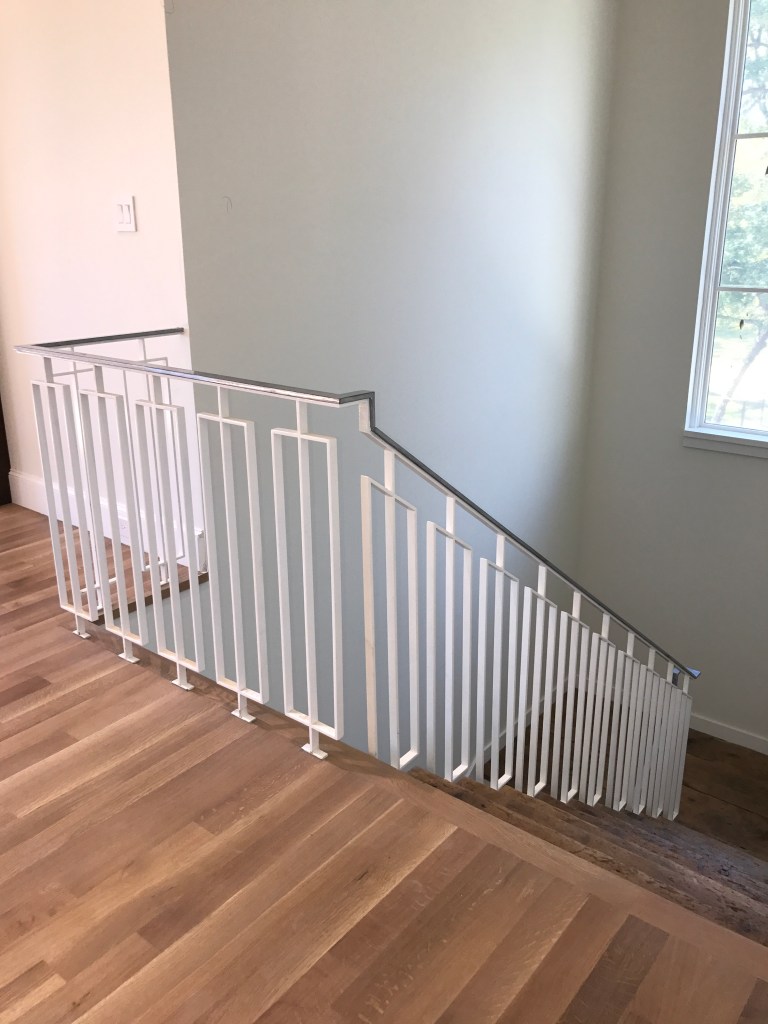 Modern-minimalistic style staircase, steel railing with white oak wood handrail.