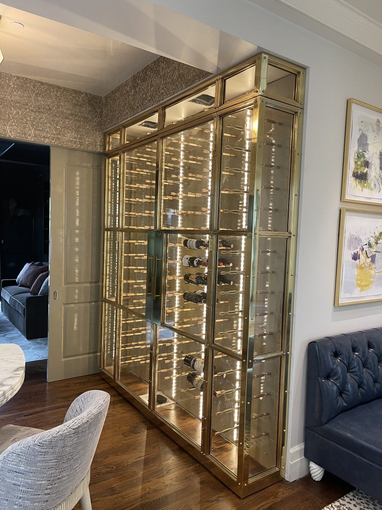 Modern luxury style brass wine glass enclosure with LED lighting.