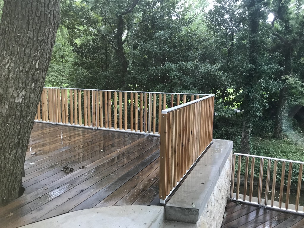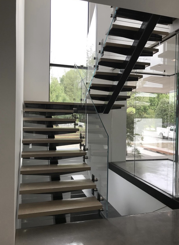 Modern-natural style steel staircase with steel stringers, maple wood steps and handrail.