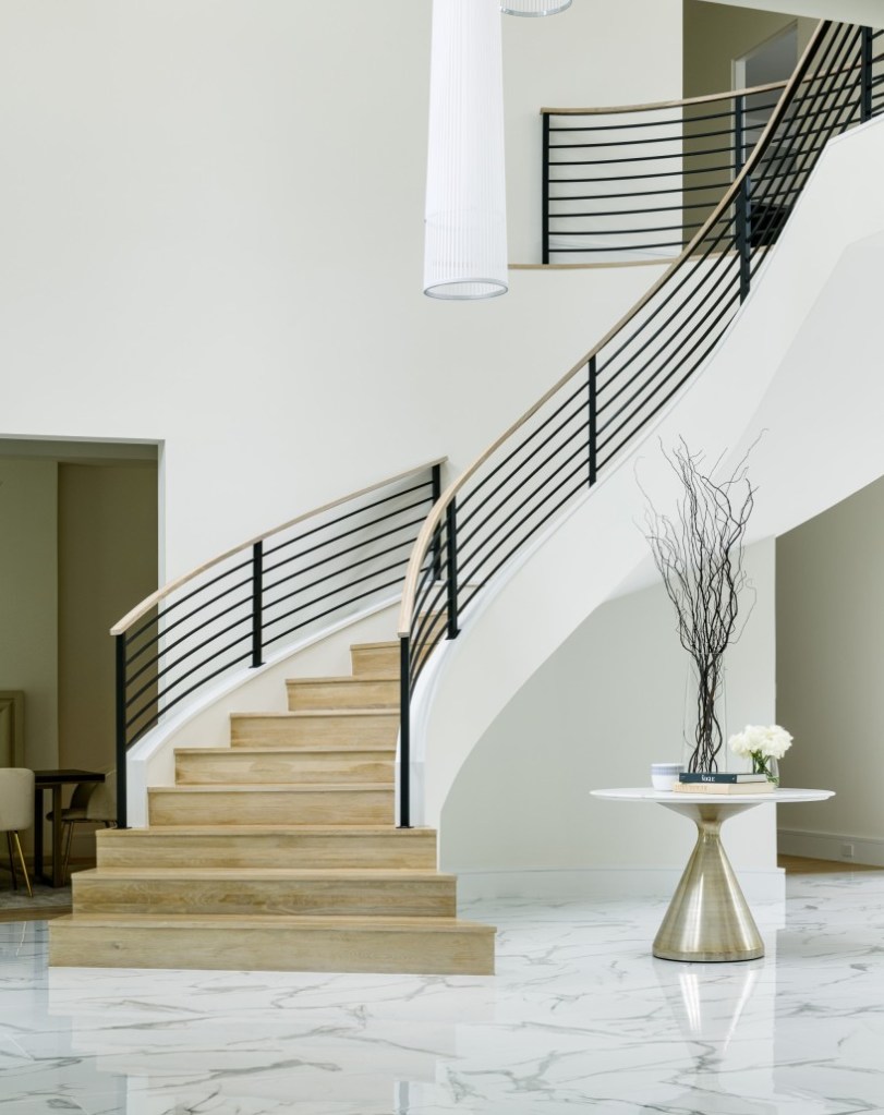 Classic French-traditional style wrought iron staircase with handmade scrolling ironwork.